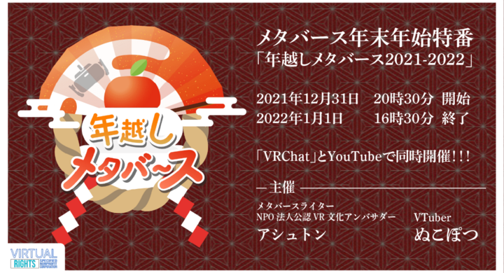 NPO法人バーチャルライツのプレスリリース(2021年12月21日 13時)。メタバースライター兼NPO法人バーチャルライツ公認VR文化アンバサダーのアシュトンおよび、VTuberのぬこぽつは、2021年12月31日20時30分~2022年1月1日16時30分の約20時間にかけてメタバースプラットフォーム「VRChat」および、YouTubeにてメタバース年末年始特番「年越しメタバース2021-2022」(以下、年越しメタバース)を実施することをお知らせいたします。