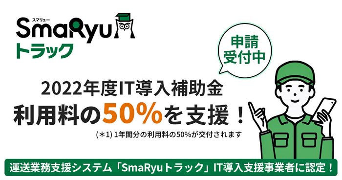 申請が採択された場合、同社が提供する運送会社向けSaaS型業務システム「SmaRyuトラック」の導入により、利用料の最大50%が補助金として支給されるようになる。