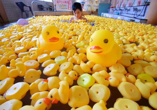 「超アヒル風呂」。湯船を黄色い大群が埋め尽くす。入浴客の傍らを優雅に泳ぎ、隣とぶつかってひっくり返る姿は、温泉を満喫しているかのようだ。