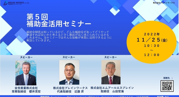 - 全額支給の助成金・補助金を活用して御社を増益させる方法セミナー(オンライン/無料)