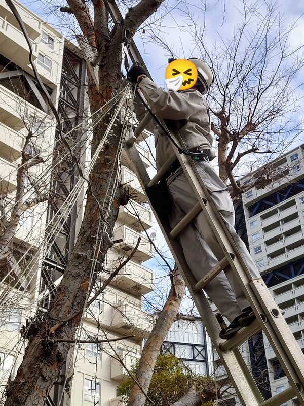 今朝は冬の街路樹を彩ったイルミネーションツリーの取り外し作業。文字通りコンクリートジャングルで無機質な町に、自治会のご厚意で毎年11月末から1月いっぱいまで華を添えていただいています。ありがとうございます!地域の高齢化もあり、参加した方はほとんどが70歳代以上。これからの高所作業は、自治会長と私の担当と定番となりそうです。#芦屋市