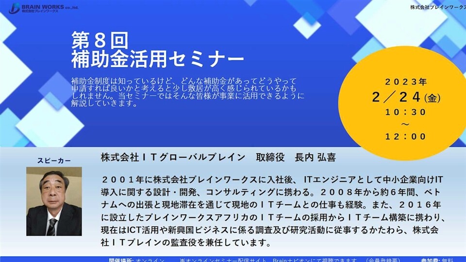 モノづくり補助金 実施者の話 · 株式会社ITグローバルブレイン 取締役 長内 弘喜 · ※通信の状況により動画の配信が止まることがありますのでご了承をお願い …