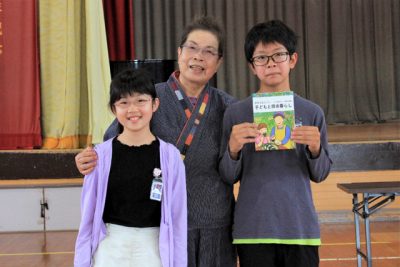 食の大切さを伝える著書を贈った蒲生芳子さん(中央)と、受け取った児童代表 自然との共存や食文化の大切さを発信しているNPO法人「手仕事舎そうあい」 …