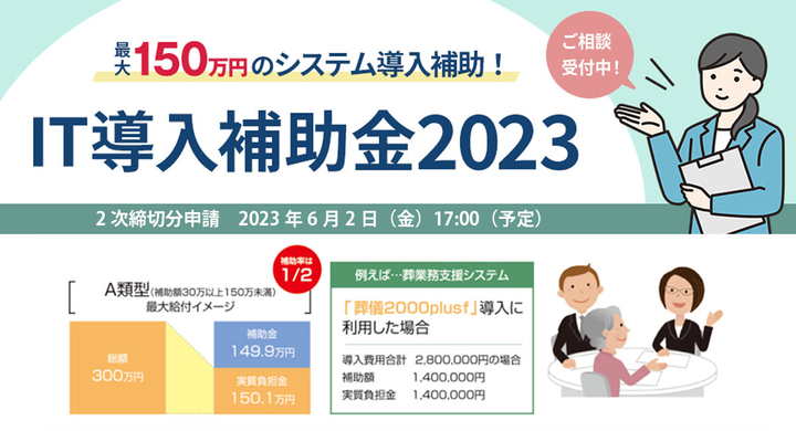 葬祭業務支援システム「葬儀2000plusf」の導入時に、IT導入補助金をご利用いただくことで最大150万円のシステム導入補助を受けることが可能となります。 葬祭 …