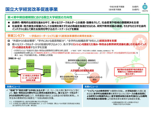 文部科学省は2023年5月9日、2023年度(令和5年度)国立大学改革・研究基盤強化推進補助金の公募を開始した。対象は地域や特定分野中核としての強み・特色 …