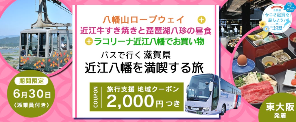 6月30日(水) 限定 割引後旅行代金7,600円〈東大阪発着・添乗員付き〉八幡山ロープウェイ+近江牛すき焼きと琵琶湖八珍御膳+ラコリーナで人気スイーツお買い物 バスで行く みんなで近江八幡へ行こう』