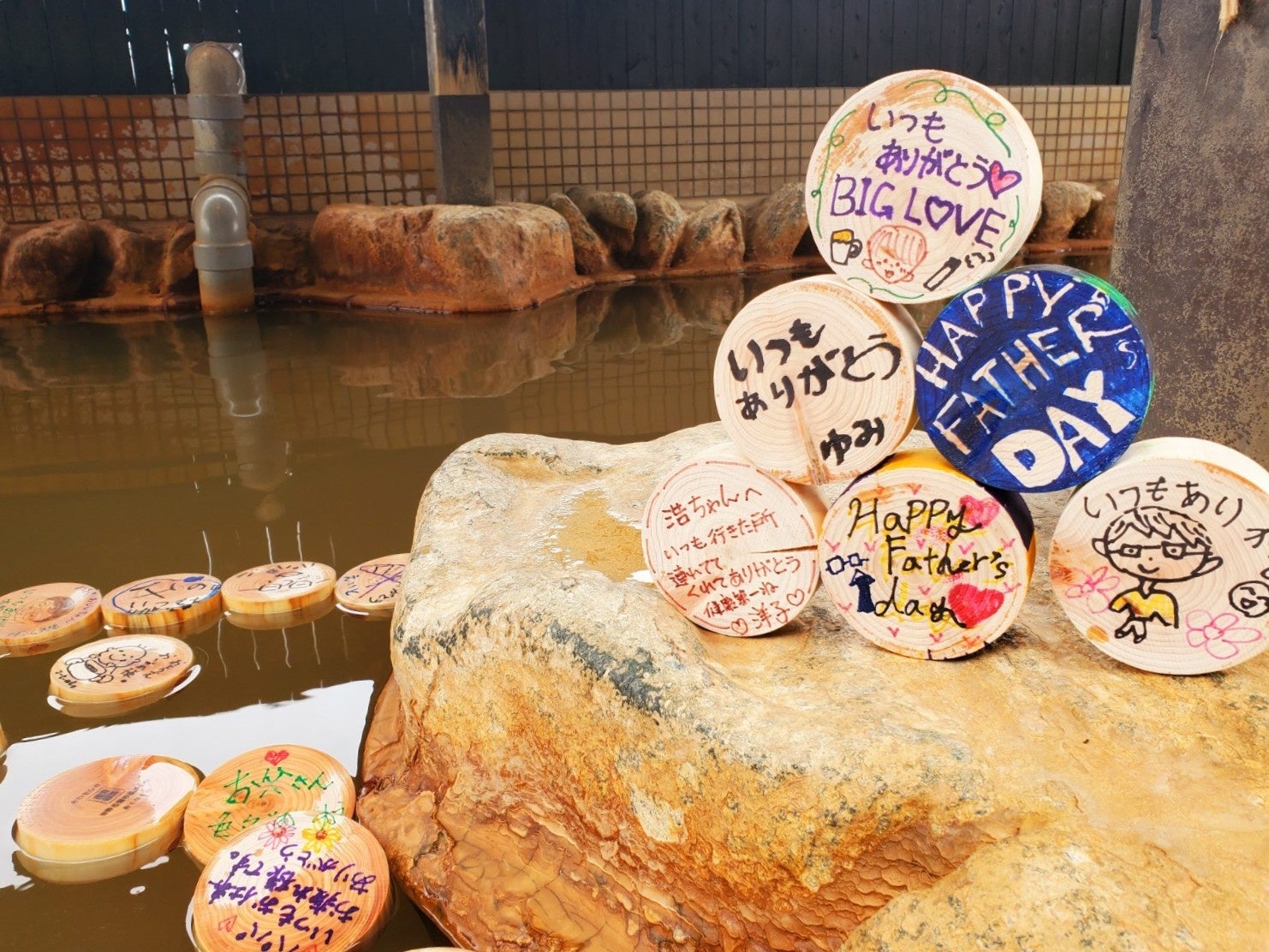 株式会社温泉道場のプレスリリース(2023年6月13日 09時12分)お父さんへの感謝を込めたメッセージがおふろに浮かびます。温浴施設 おふろcafeで「父の⽇100 …