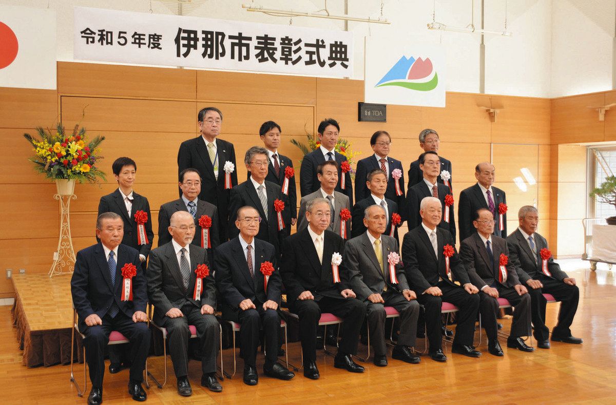 伊那市は3日、教育文化や産業、保健衛生などの分野で功績があった市民らをたたえる本年度の市表彰式典を市役所で開き、11の個人と6団体が表…