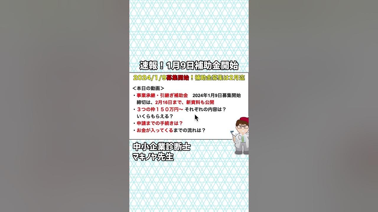 速報1月9日・3つの枠150万円から事業承継引継ぎ補助金の募集開始・2月16日まで・新資料も公開【中小企業診断士YouTuber マキノヤ先生】第1666回.