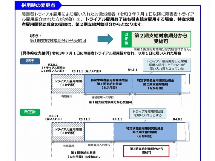 厚生労働省は2021年7月1日から特定求職者雇用開発助成金(特定就職困難者コース)をトライアル雇用助成金(障害者トライアルコース)と併用する …