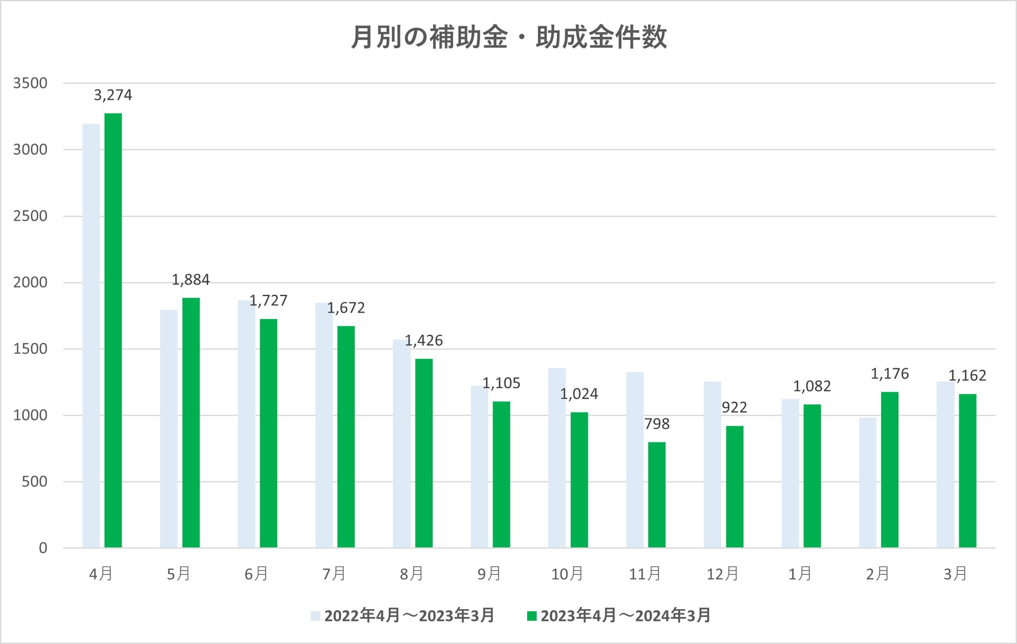 ◇月別の補助金・助成金件数. 「入札王」のデータベース内で「助成金・補助金」に分類されているものから算出。官公庁、地方自治体からの情報以外に、一部 …