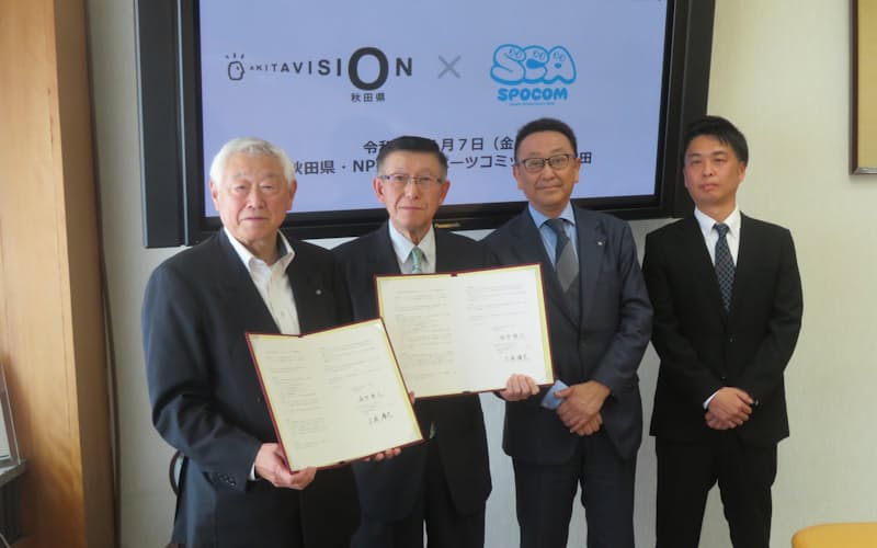 秋田県は7日、NPO法人スポーツコミッション秋田(秋田市)と連携協定を結んだ。県内は人口減少や高齢化に伴い、スポーツ大会を運営する担い手の不足などが …