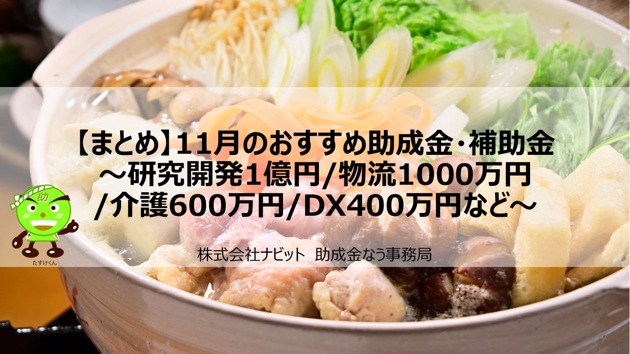 【11/28より】「【まとめ】11月のおすすめ助成金・補助金~研究開発1億円/物流1000万円/介護 …
