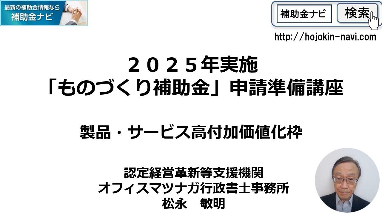 この講座では、2025年実施「ものづくり補助金」について、概要を解説の上で、採択確率を高める為の申請準備方法解説しています。 「補助金ナビ」の記事も …