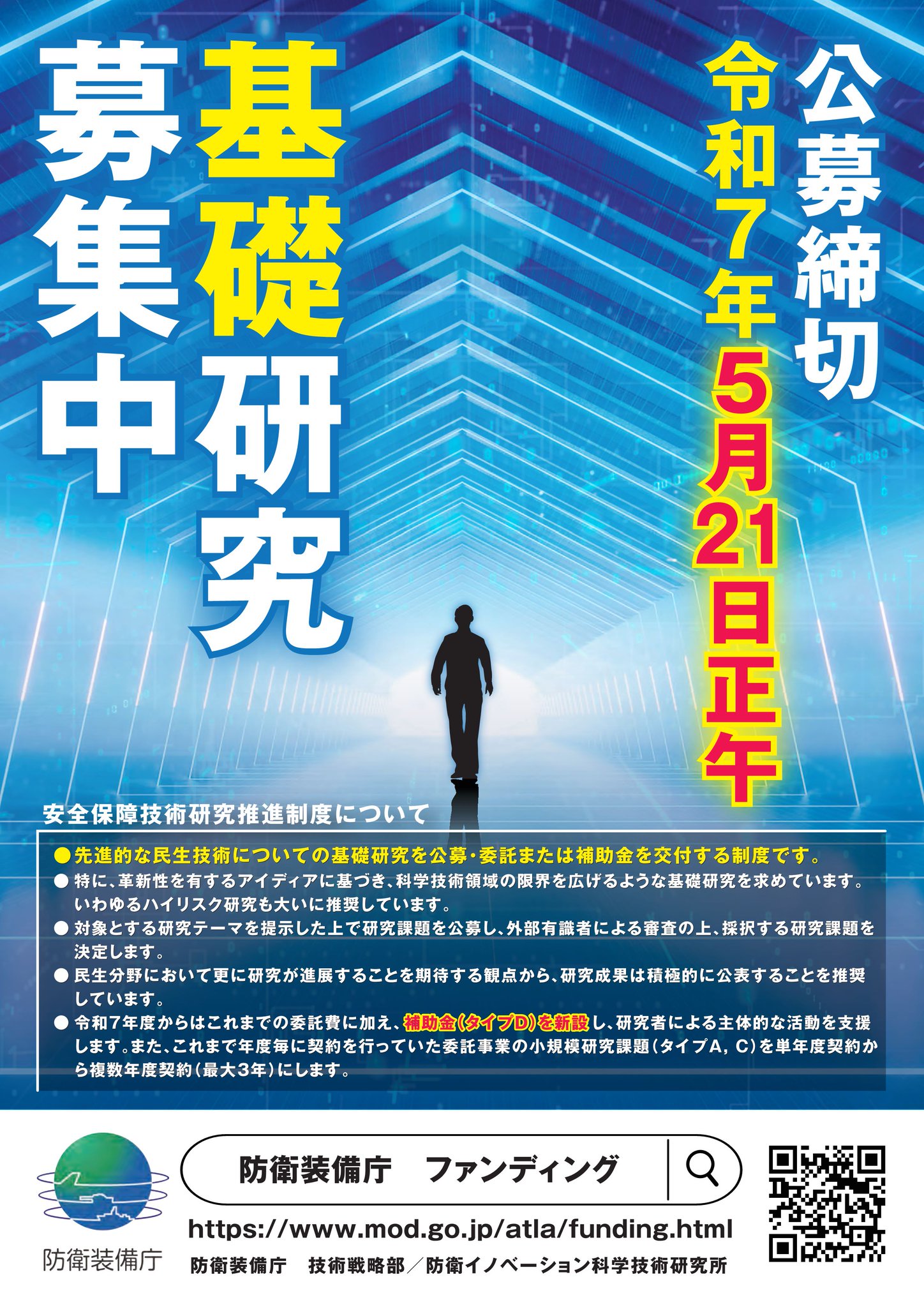 安全保障技術研究推進制度 】 この度、令和7年度の公募を開始しました。令和7年度から、より応募しやすい制度となるよう、補助金(タイプD)を新設し、研究者 …