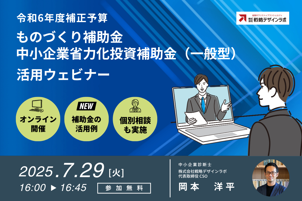 2025年7月29日(火)にウェビナーを開催いたします。今回のテーマは「ものづくり補助金」と「中小企業省力化投資補助金(一般型)」について。