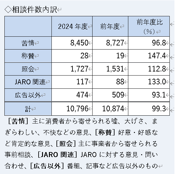 JARO(日本広告審査機構)は、2024年度における審査状況を発表した。JAROが受け付けた相談(苦情・称讚・照会・JARO関連・広告以外)について集計分析している。