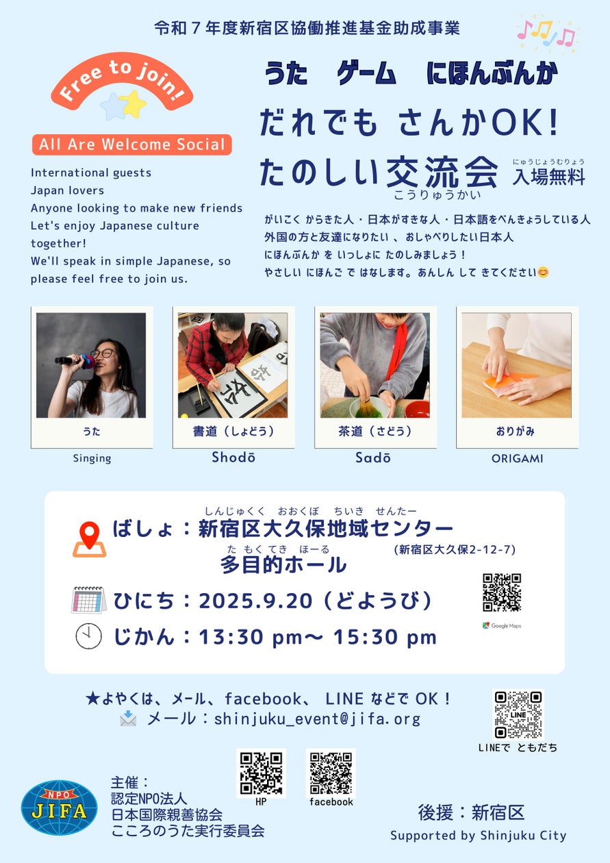 本事業は、令和7年度新宿区協働推進基金助成事業として実施するもので、外国人と日本人が日本文化を体験しながら交流するイベントです。単なる娯楽の場に …