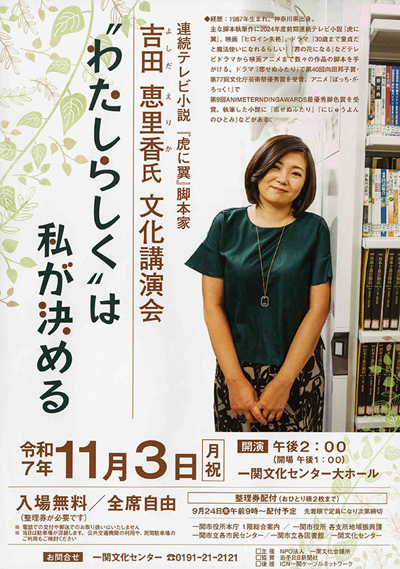 NPO法人一関文化会議所主催の文化講演会(岩手日日新聞社協賛、一関ケーブルネットワーク後援)は、11月3日に一関市大手町の一関文化センターで開かれる。2024年度前期のNHK連続テレビ小説「虎に翼」