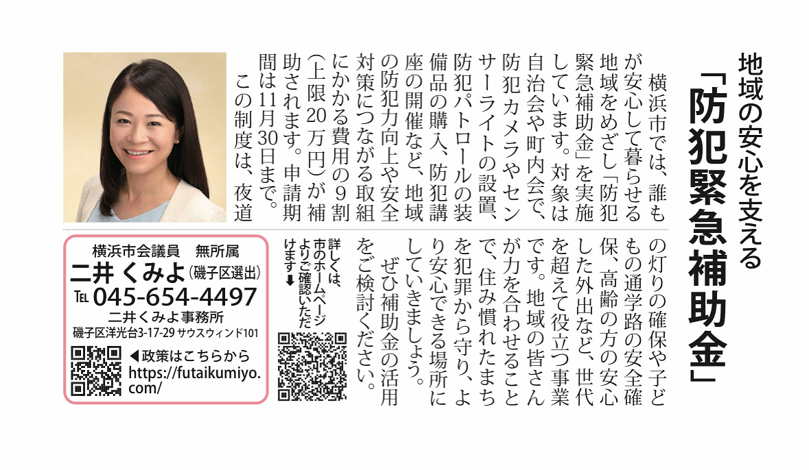 48. 【横濱タウン新聞掲載】防犯緊急補助金のご案内 - 二井くみよ(フタイクミヨ) - 選挙ドットコム