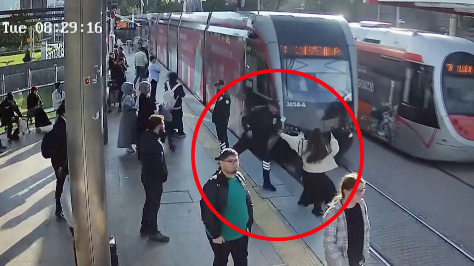 カイセリ、トルコ、10月17日 (AP) ―トルコ中部カイセリで10月14日、線路に足を踏み入れた女性をとっさの判断で路面電車から救った警備員が表彰された。