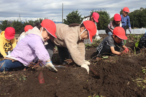 地元老人会の神前仙寿会(内田幸輝会長)のメンバーに、苗の植え方を教わった。水やりや草取りにも訪れ、これまで成長を見守ってきた。 児童らは畑の中に …