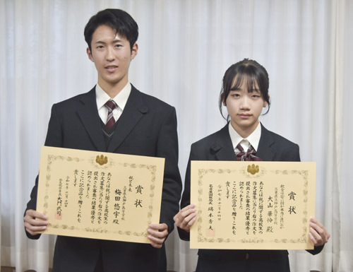 【鈴鹿】三重県鈴鹿市神戸四丁目の県立神戸高校(奥山博之校長)で14日、国税庁が主催する「税に関する高校生の作文」の表彰式があり、2年大山華怜さん(17)が名古屋国税局長賞、2年梅田悠宇さん(17)