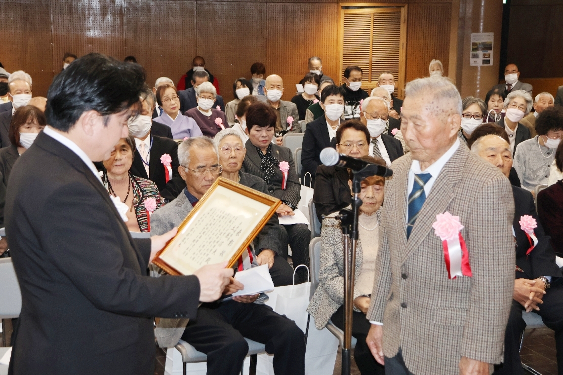 安部徹也町長が「支え合いの核として尽力されました。感謝します」とあいさつ。ダイヤモンド婚(結婚60周年)の夫婦や、福祉、老人クラブ活動、民生委員・児童委員 …