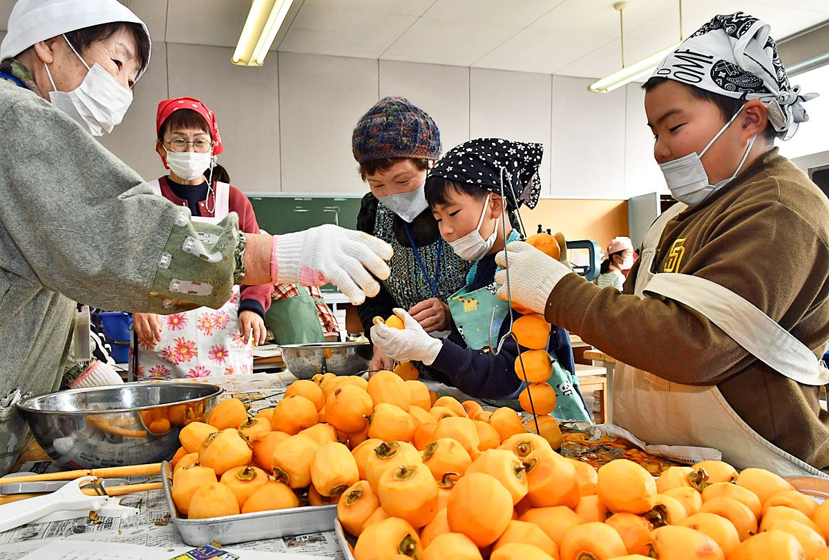青森県八戸市の是川地区老人クラブ連合会(古戸良一会長)は20日、是川小学校で干し柿作りを指導し、同校2年生12人と和やかに交流した。 干し柿作りには17日に校庭の柿の木からもいだ妙丹柿(みょう