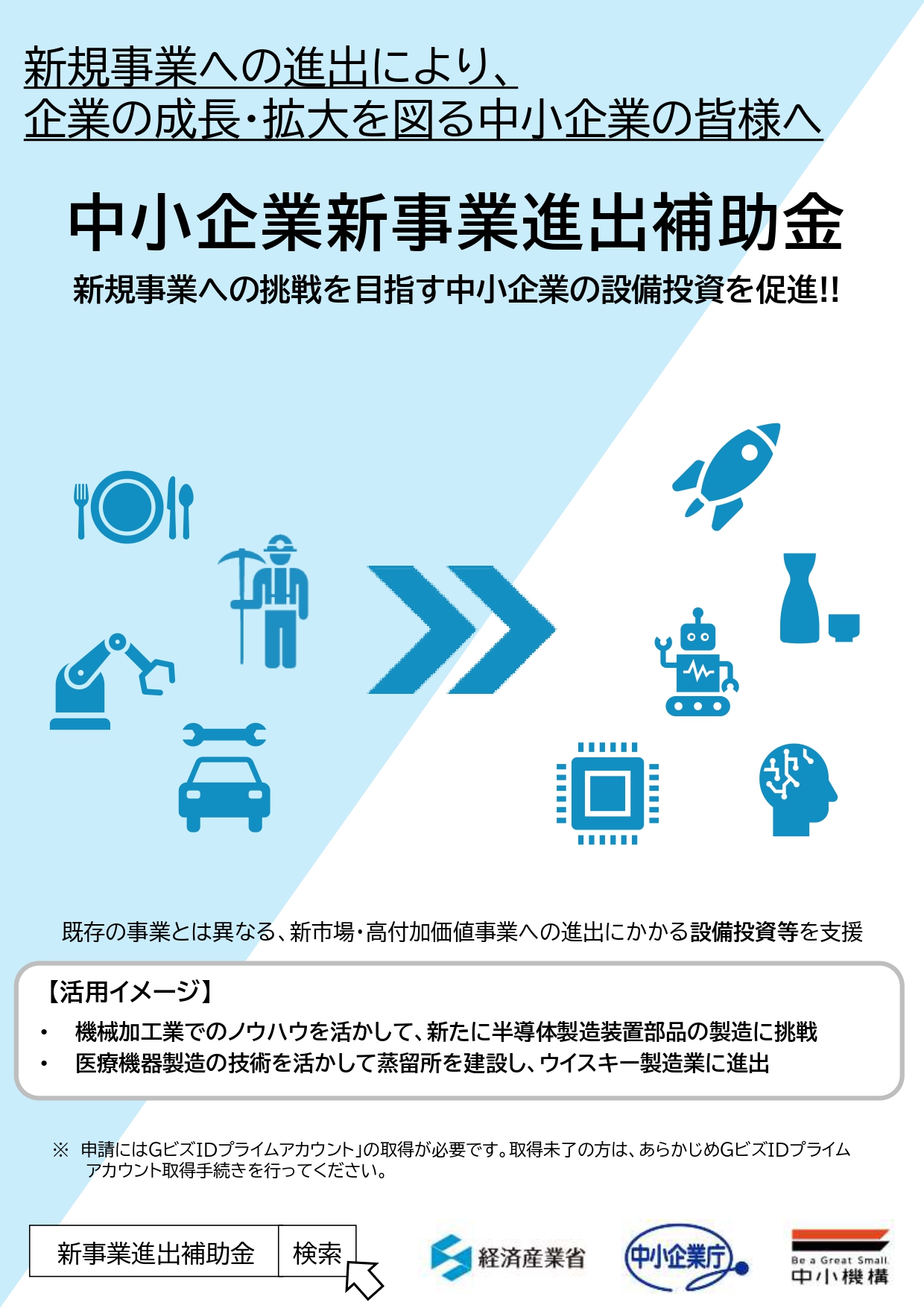 中小企業新事業進出促進補助金【第2回】 … 中小企業等が行う、既存事業と異なる事業への前向きな挑戦であって、新市場・高付加価値事業への進出を後押しすること …