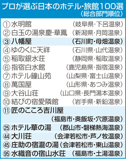 旅行新聞新社(東京都)が12日までに発表した「第51回プロが選ぶ日本のホテル・旅館100選」で、八幡屋(福島県石川町・母畑温泉)が総合3位に選ばれた。