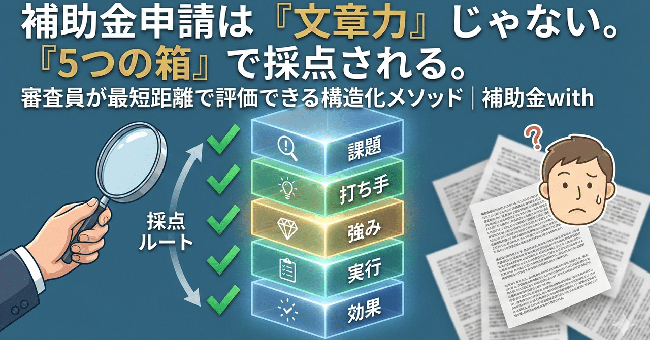 これ、文章力の問題というより “情報の配置ミス” なんです。 審査員が必要な材料を、必要な順番で拾えない。 補助金申請は「5つの箱」に分けると …