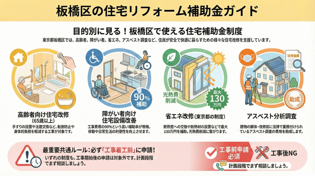 【2026年最新】板橋区のリフォーム補助金4選を徹底解説!高齢者・障がい者(最大90%補助)の住宅改修や、東京都の省エネ助成(最大130万円)、アスベスト調査費 …