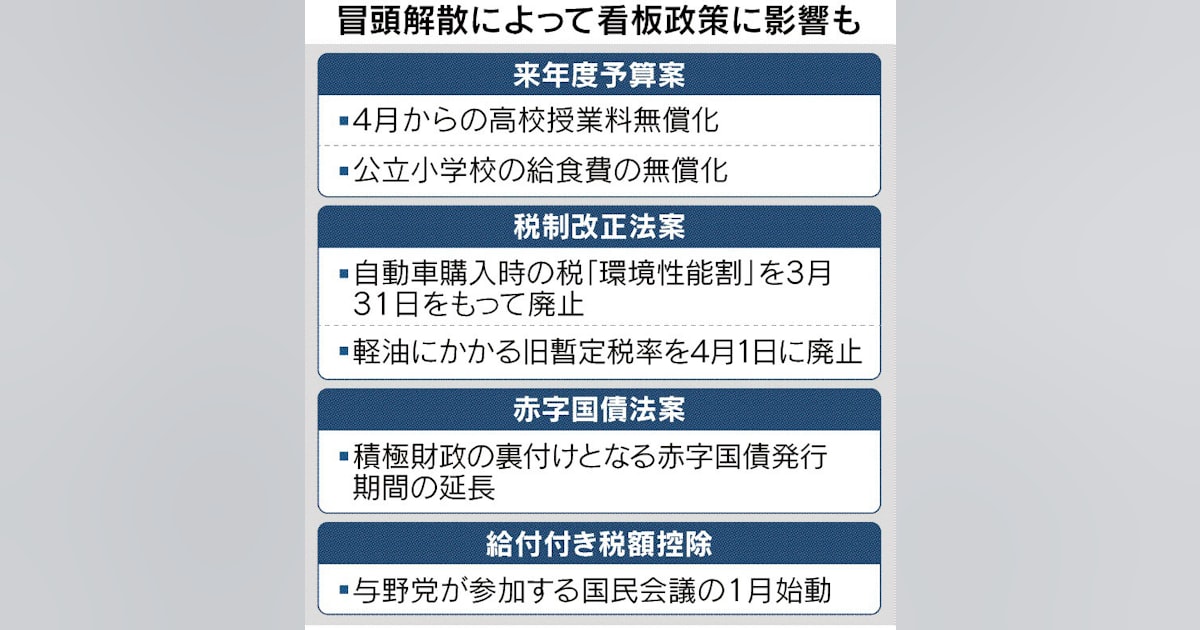 - 看板政策、冒頭解散が影 4月実施の高校無償化・車減税 法的裏付け遅れ懸念 - 日本経済新聞