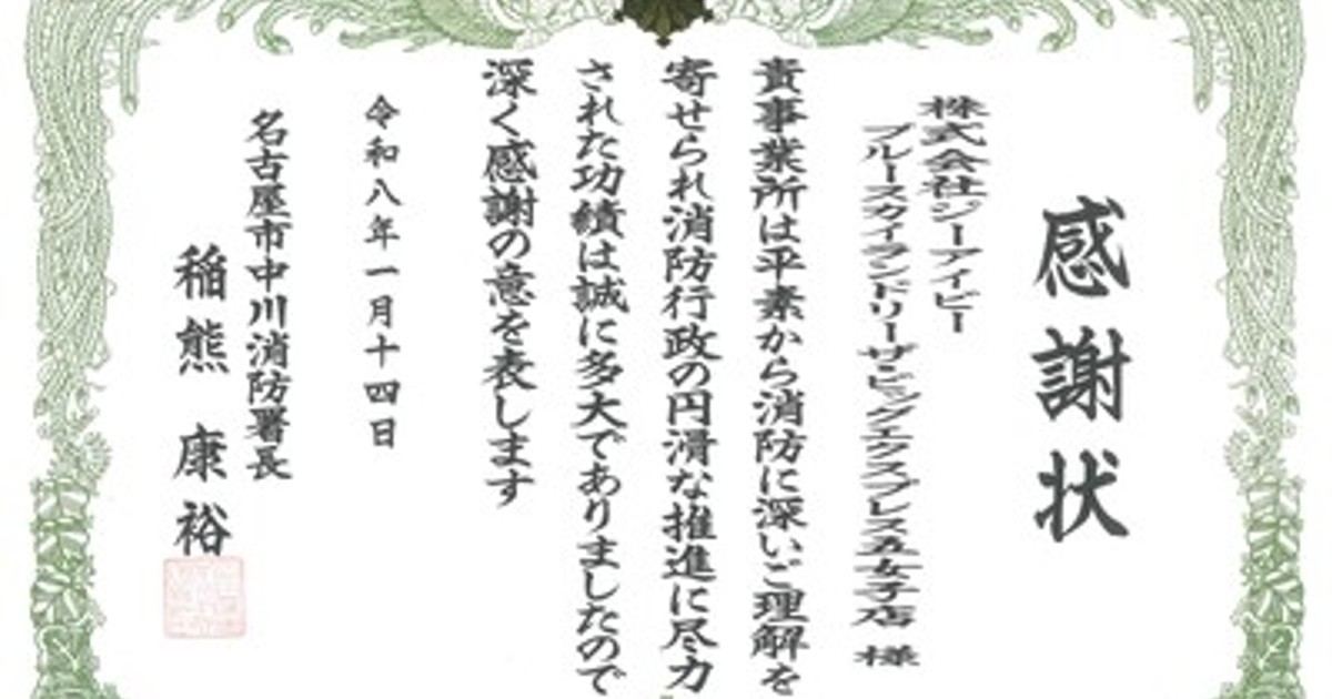プレスリリース:株式会社ジーアイビー 名古屋市 中川区消防表彰式にて、中川消防署より感謝状を授与(PR TIMES) | 毎日新聞