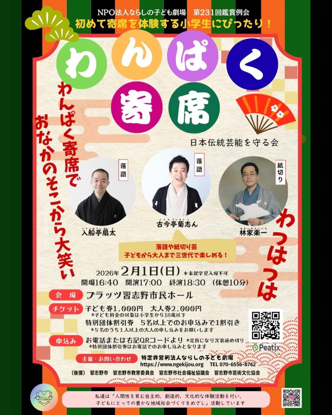■ NPO法人ならしの子ども劇場「わんぱく寄席」主催のならしの子ども劇場さんは習志野市の子供たちの為に長年活動されている団体です。小学生の“はじめての寄席体験”にもぴったりな企画です。落語・紙切りといった日本の伝統芸能を、子どもから大人まで三世代で楽しめる内容となっています。日時:2026年2月1日(日)会場:プラッツ習志野 市民ホール習志野市は「音楽のまち」として知られていますが、こうした...