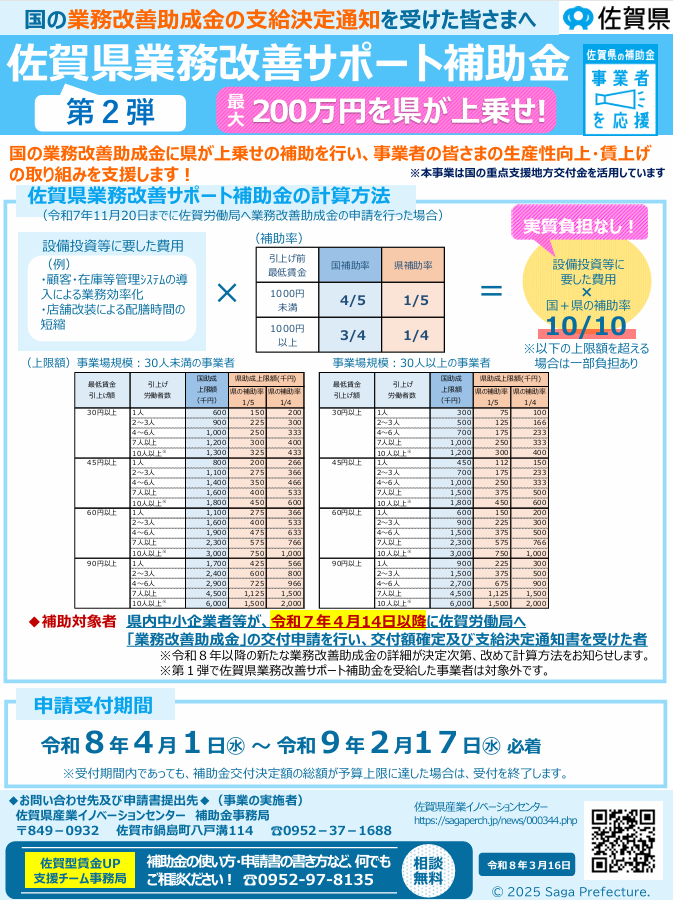 佐賀県では、国の業務改善助成金(厚生労働省管轄)の支給決定通知を受けた事業者に対し、上乗せ補助を行う「佐賀県業務改善サポート補助金」の申請受付を開始 …