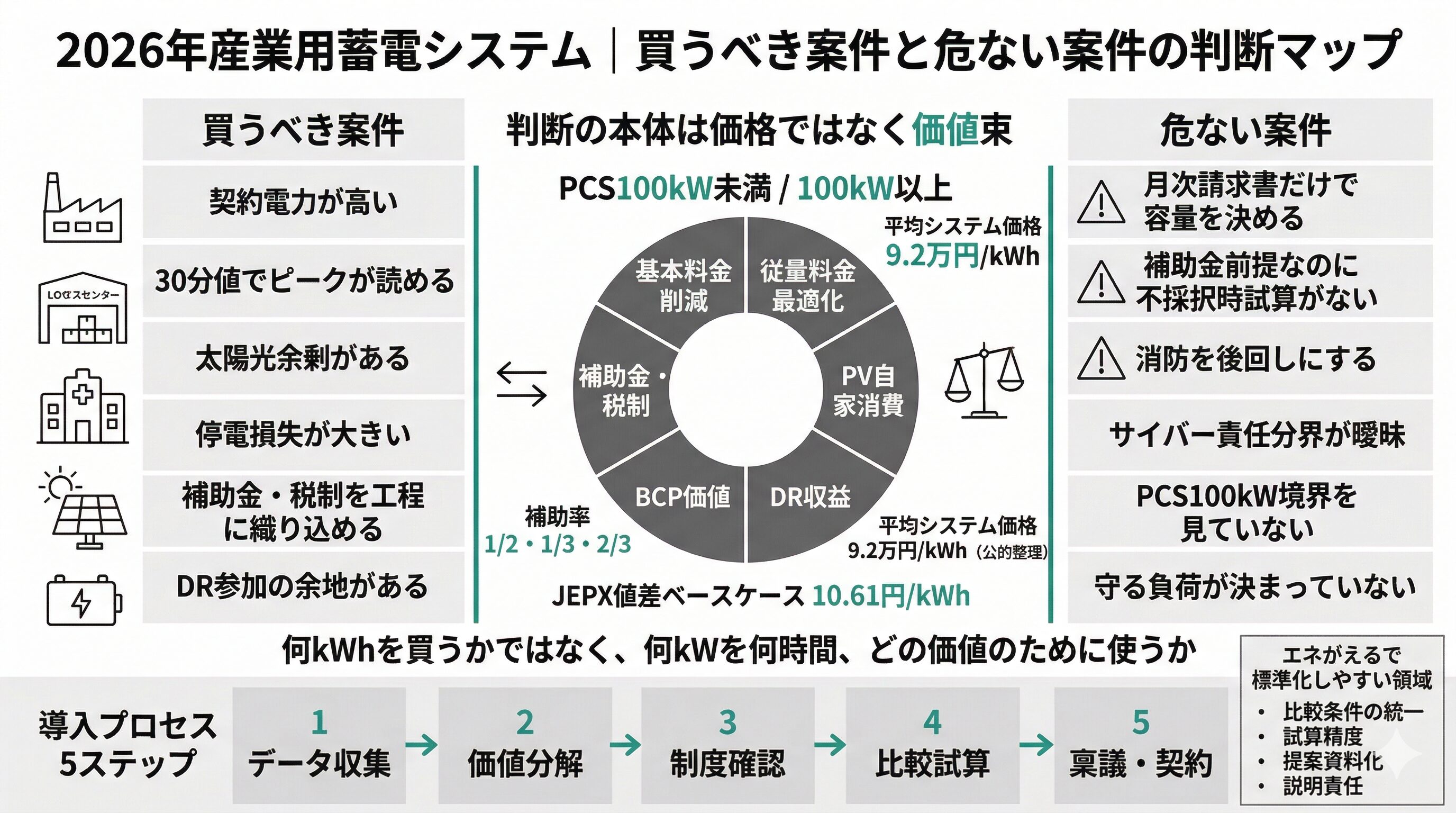産業用蓄電システムは、kWh単価ではなく「基本料金削減・PV自家消費・DR・BCP・補助金」の束で評価すべきです。 2026年3月時点では、SII補助がPCS100kW未満と …