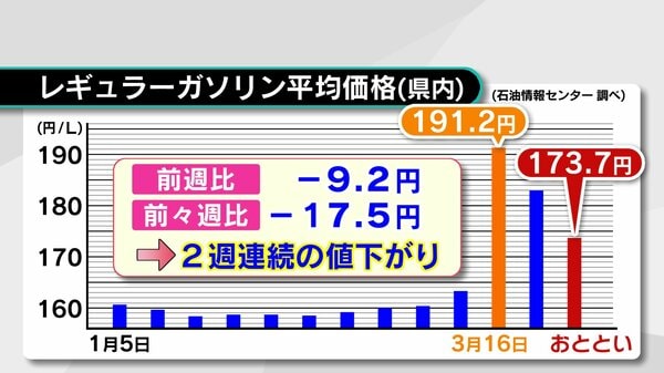 - 補助金効果 ガソリン価格2週連続の値下がり 173.7円に 今後は「ほぼ横ばい」の予想 大分