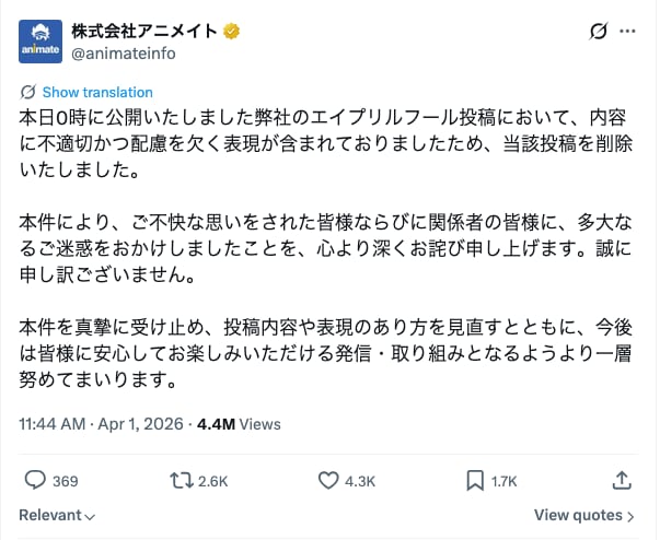 アニメイトがXを更新しました。 「本日0時に公開いたしました弊社のエイプリルフール投稿において、内容に不適切かつ配慮を欠く表現が含まれておりまし …