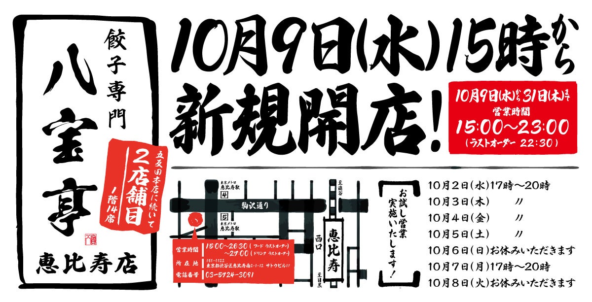 - 【餃子専門 八宝亭 恵比寿店】10月9日(水)新規開店!【五反田本店に続き2店舗目!】