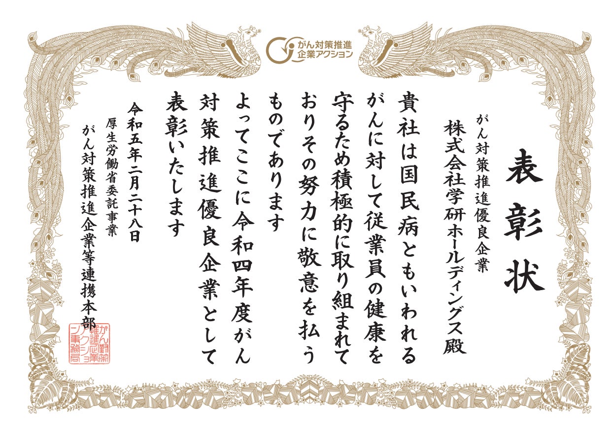 - 株式会社学研ホールディングスが厚生労働省「がん対策推進優良企業」として表彰されました
