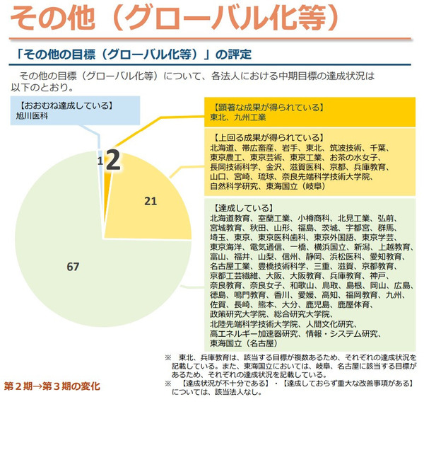 文部科学省は2023年年3月23日、国立大学法人・大学共同利用機関法人の教育や業務運営等に関する第3期中期目標期間の評価結果を公表した。このうちグローバル化等の評価では、東北大学と九州工業大学がもっとも高い評価を得た。