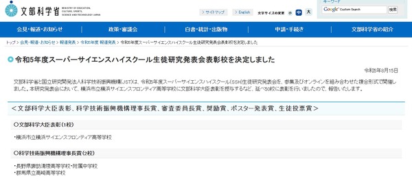 文部科学大臣表彰は、横浜市立横浜サイエンスフロンティア高等学校が授与した。 教育行政 文部科学省. 2023.8.16 Wed 13:45.
