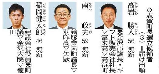 - 志賀町長選、24日投開票 無所属新人3氏の争い - 中日新聞Web