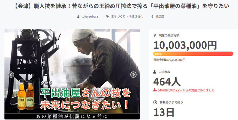 目標額1000万円達成!「平出油屋の菜種油」を守るためのクラウドファンディング。ネクスト …