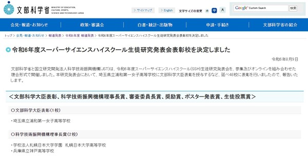 文部科学省は、2024年度スーパーサイエンスハイスクール(SSH)生徒研究発表会表彰校を決定した。埼玉県立浦和第一女子高等学校に文部科学大臣表彰を授与し、のべ48校を表彰した。