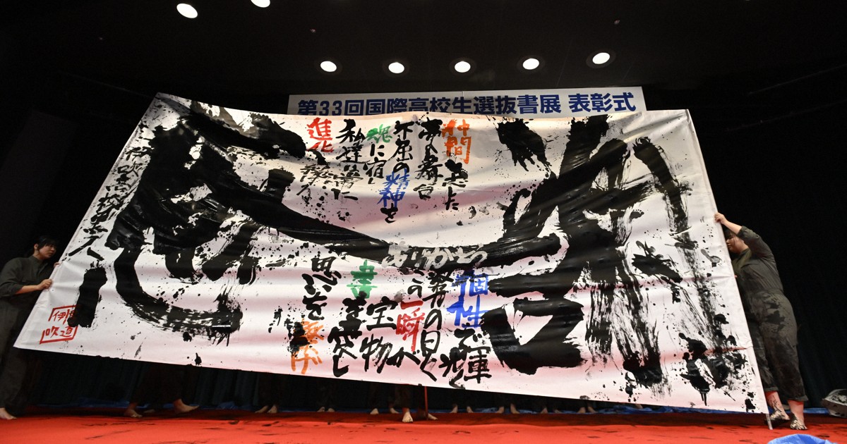 第33回国際高校生選抜書展の表彰式で書道パフォーマンスを披露する団体の部で全国優勝した滋賀県立伊吹高校の生徒たち=大阪市北区の毎日新聞大阪本社 …