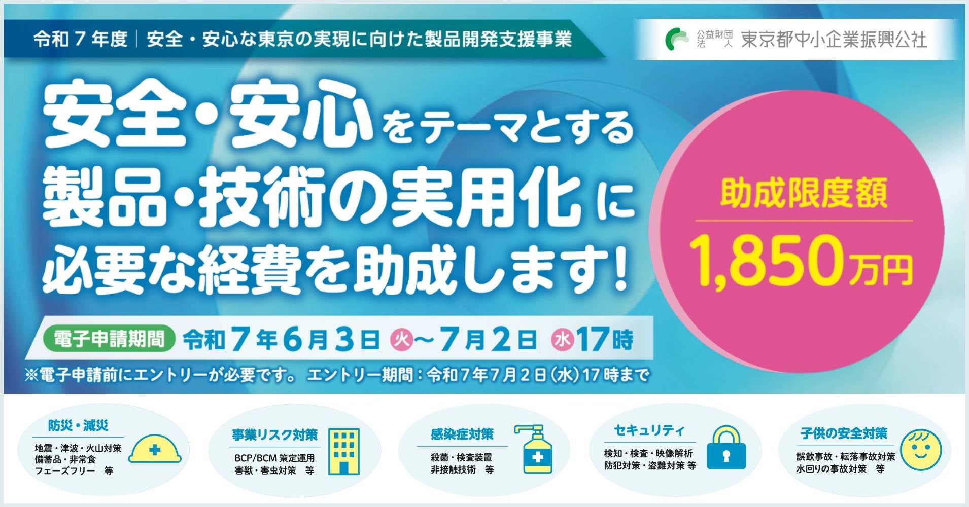 公益財団法人東京都中小企業振興公社のプレスリリース(2025年5月6日 17時11分)安全・安心な製品開発に最大1,850万円助成!【専門家派遣も8回まで無料、先着20社】