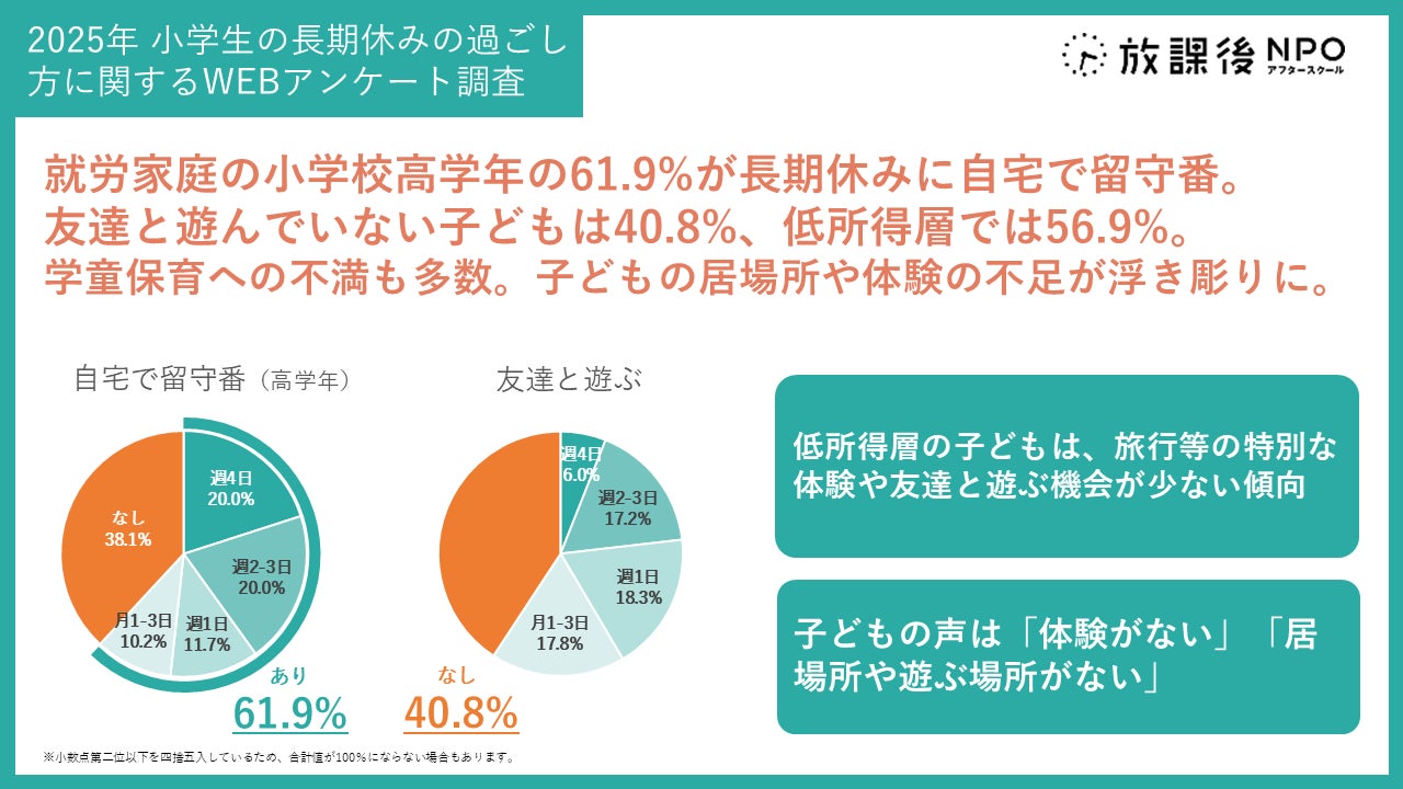 特定非営利活動法人放課後NPOアフタースクールのプレスリリース(2025年6月26日 10時00分)【小学生の長期休みの過ごし方|独自調査結果】高学年の61.9%が自宅 …